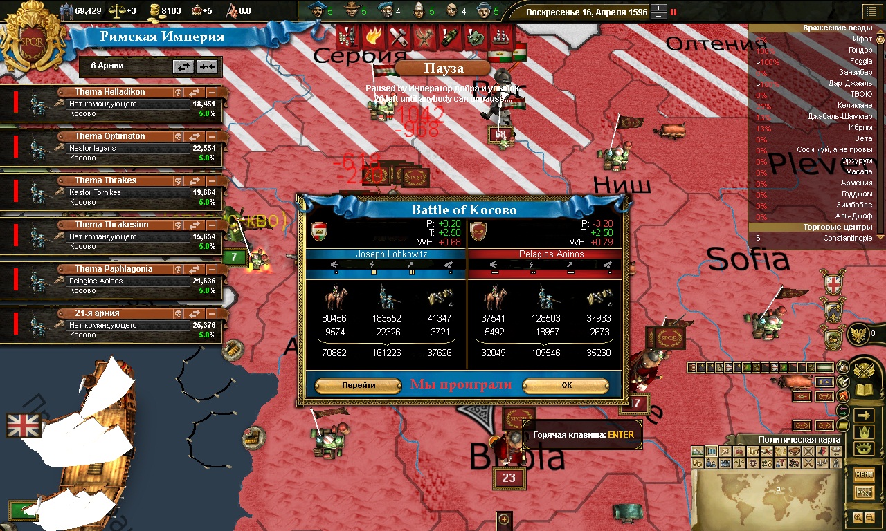 Также удалось отбить ценой больших усилий ещё одно наступление в Косово. Технически рим там проиграл, но отступил вовремя, а потому сохранил порядок и получил пополнения. Ринат не решился продолжать атаку, отступил и стал набирать сил.
