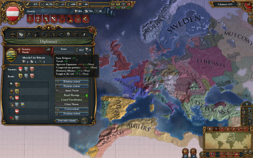В EU3 отношения были двунаправленными. То есть если вам нравится кто-то, значит вы тоже ему нравитесь. Это определенно не так в реальном мире, и это то, что мы действительно хотели изменить в EU4. Сейчас кто-то может плохо к вам относиться, в то время когда вы к нему – хорошо, и для этого мы адаптировали систему, ранее введенную в Crusader Kings II.