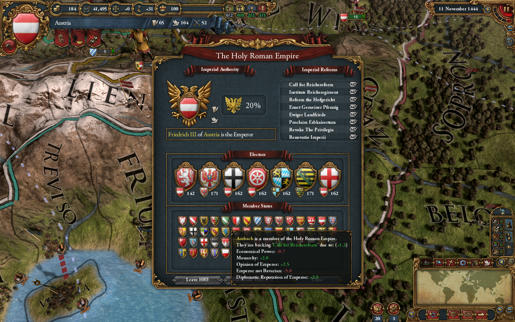 Имперские реформы больше не осуществляются через события, где вы не могли видеть, как голосует сейм. Сейчас это понятная механика, когда вы выбираете действие, призываете к голосованию, и можете видеть, как каждый член будет голосовать и почему. Следовательно, вы можете разыгрывать дипломатическую игру, дабы склонить голосующих на свою сторону и ввести реформы. Имеющий высший авторитет может посодействовать ограждению участников сейма [от стороннего влияния], но каждый раз, когда вы принимаете реформу, вы будете терять весь ваш авторитет, даже если для голосования требуется только 50. (Тут бонус Австрии на +10% имперского авторитета придется весьма кстати).