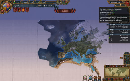 Так как работает эта система? Здесь снова оказывается полезно разделение игры на административный, дипломатический и военный компоненты. Каждый месяц вы получаете очки, в зависимости от вашего ранга в этих трех разных областях. Лучшие 10 стран в каждой области зарабатывают очки, и их количество определяется вашим рангом в каждой категории. Вы не можете потерять ваши очки, они не снизятся, и тут нет штрафа за отставание, но если вы покинули первую десятку, то в этот месяц вы ничего не заработаете.