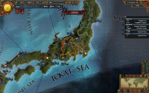 Мы полностью переделали карту, с особым вниманием к историческому разделению Японии. Сейчас она состоит из 28 провинций, в том числе с провинциями Хоккайдо и Сахалин, еще не колонизированными на 1444 год. Эти 28 провинций поделены между примерно двадцатью различными японскими Дайме, включая таких известных, как Датэ, Токугава и Уэсуги.