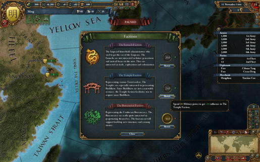 В EU4, при игре за Китай у вас развязаны руки, но в зависимости от того, какая фракция находится у власти, с вас снимаются некоторые штрафы, с которыми Китай сталкивается из-за китайской бюрократии. Эта особенность подразумевает определенный список проблем, которыми вас может озадачить иерархическое и жестко приверженное традициям китайское правительство. Каждая фракция отключает несколько таких штрафов.