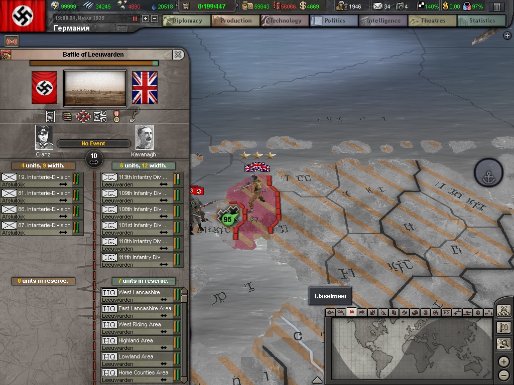 | Переиграв, я попёр на Францию толпой в 580 тыс. солдат + 300 тыс. в резерве на Восточном фронте. Англичане как обезумели. После того, как они провалили две высадки потеряв 10-15 дивизий они высадились снова. Несмотря на то, что Япония забирает у них Индию и половина армии дерётся как экспедиционные войска, они всё ещё высаживаются. И чем! Последний раз высадился десяток штабов и 5-8 гарнизонных дивизий.