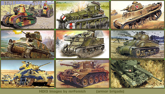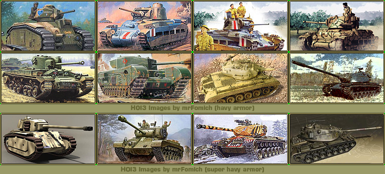 3д-графика выбивается из общего стиля, но это не от хорошей жизни. Если несогласие - КАТЕГОРИЧЕСКОЕ, лезем минимум в википедию, знакомимся с модельным рядом, ищем достойные изображения на просторах www и кидаем мне В ЛИЧКУ ссылку на эту картинку. А в полемике "нравиццо-ненравицо", я учавствовать не хочу... Логично предположить, что я вставил не первую попавшуюся картинку! Кстати чистое фото с аглицкого музея выглядит более галимо, а вырезать это дело из экспозиции РУЧКАМИ, долгий и неблагодарный труд. Мне и так хватает того, что необходимо вырезать. Для маньяков развития танковых и иных технологий, решил делать запас в +2 картинки (для общих картинок). К примеру в танковую линейку идут еще Комет и Центурион Графический мод HOI3 созданы внятные иконки, вместо натофских значков http://mrfomich.narod.ru/HOI/hoi3_icons_byfomich1_1.zip посмотреть: http://mrfomich.narod.ru/HOI/mrfomich_demo1_1.jpg